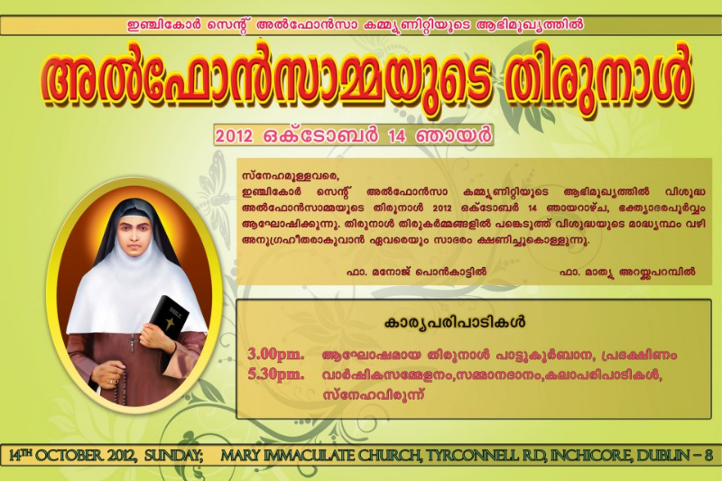 പ. കന്യകാമറിയത്തിന്റെയും വി. അൽഫോൻസാമ്മയുടേയും സംയുക്ത തിരുനാൾ ഓക്ടോബർ 11 ഞായറാഴ്ച്ച ഇഞ്ചിക്കോർ മേരി ഇമ്മാക്കുലേറ്റ് ദേവാലയത്തിൽ