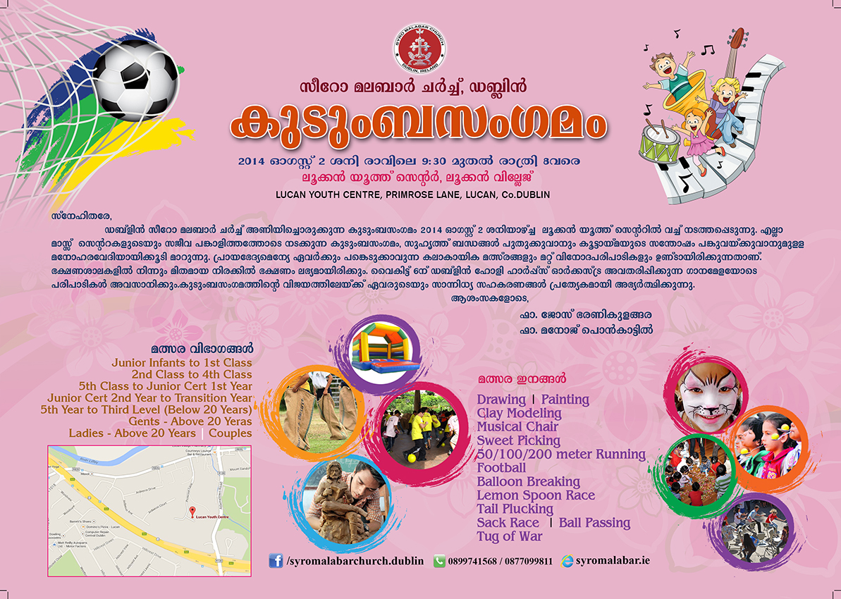 6 മണി മുതല് 8 മണി വരെ ഡബ്ലിന് ഹോളി ഹാര്പ്സ് ന്റെ ഗാനമേളയും ഉണ്ടായിരിക്കും.മിതമായ നിരക്കില് ഉച്ചഭക്ഷണവും സ്നാക്സും ഫുഡ് കോര്നെറില് ലഭ്യമാണ്. സഭാംഗങ്ങള് എല്ലാവരേയും ഈ കുടുംബസംഗമത്തിലേക്ക് സ്നേഹപൂര്വ്വം ക്ഷണിക്കുന്നതായി ഡബ്ലിന് സീറോ മലബാര് ചാപ്ലൈന്സ് അറിയിച്ചു.