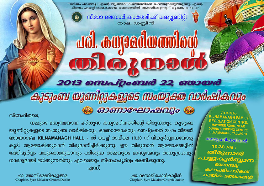 താല സീറോ മലബാര് സഭാ കൂട്ടായ്മ മാതാവിന്റെ ജനനത്തിരുനാളും കുടുംബ കൂട്ടായ്മകളുടെ വാര്ഷികവും മതബോധന വാര്ഷികവും സെപ്റ്റംബര് 22ന് താല KILMAINAGH COMMUNITY HALL-ല് വച്ച് നടത്തുന്നു.
